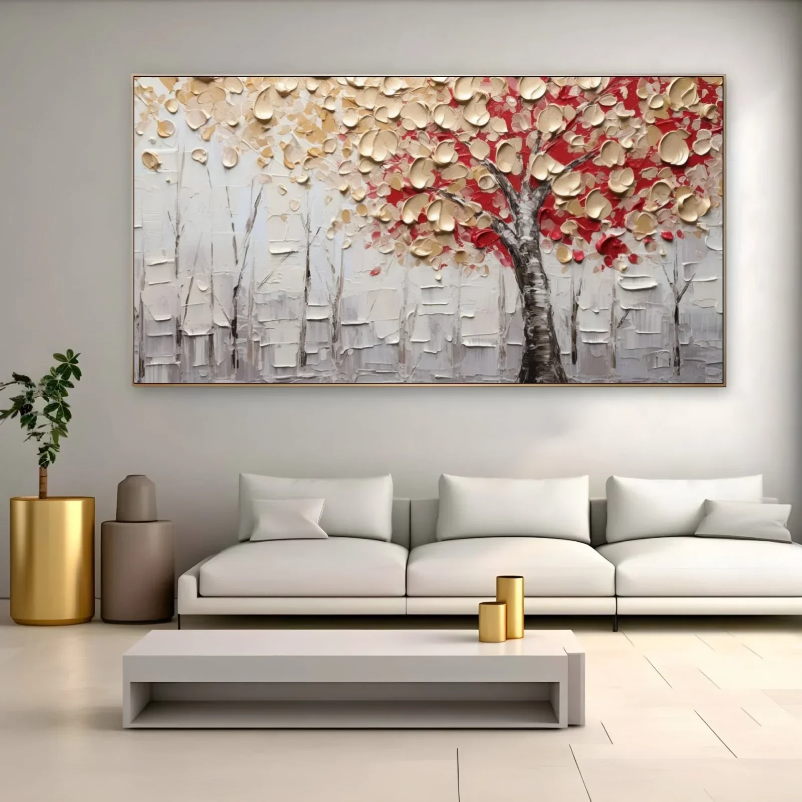 Questa opera d'arte cattura la bellezza e la tranquillità di un momento autunnale. L'albero centrale, con le sue foglie dorate e rosse, simboleggia la transizione e il cambiamento, mentre lo sfondo sfumato suggerisce un'atmosfera di calma e riflessione. È un pezzo perfetto per aggiungere un tocco di eleganza e serenità a qualsiasi ambiente.