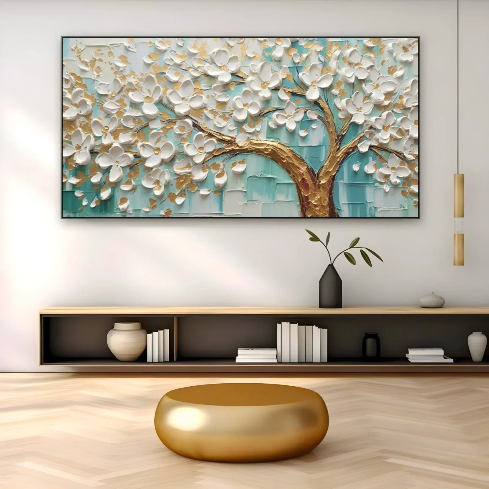 I colori predominanti nel quadro sono il bianco dei fiori e il dorato del tronco e dei rami, che creano un contrasto elegante con lo sfondo turchese. Le sfumature dorate aggiungono un tocco di lusso e raffinatezza, mentre il turchese dello sfondo evoca una sensazione di calma e serenità.