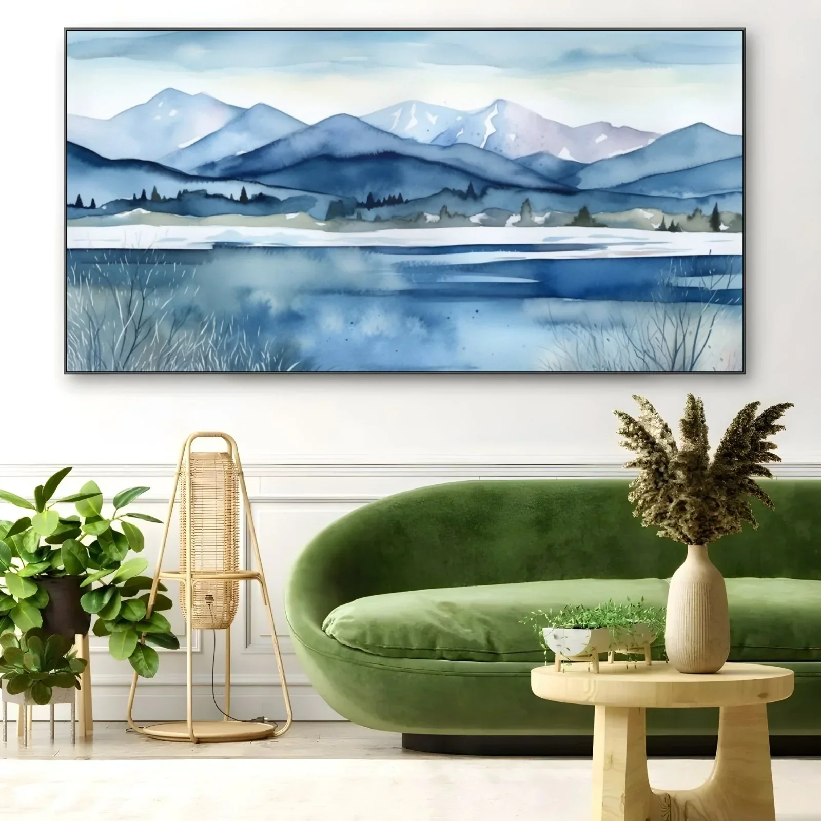 Questa stampa su tela, intitolata "Armonia Alpina", cattura la serenità e la maestosità di un paesaggio montano. Le montagne si ergono imponenti sullo sfondo, con cime innevate che brillano sotto un cielo azzurro pallido. La gamma di colori utilizzata varia dai toni freddi del blu e del grigio, creando un'atmosfera calma e rilassante.
