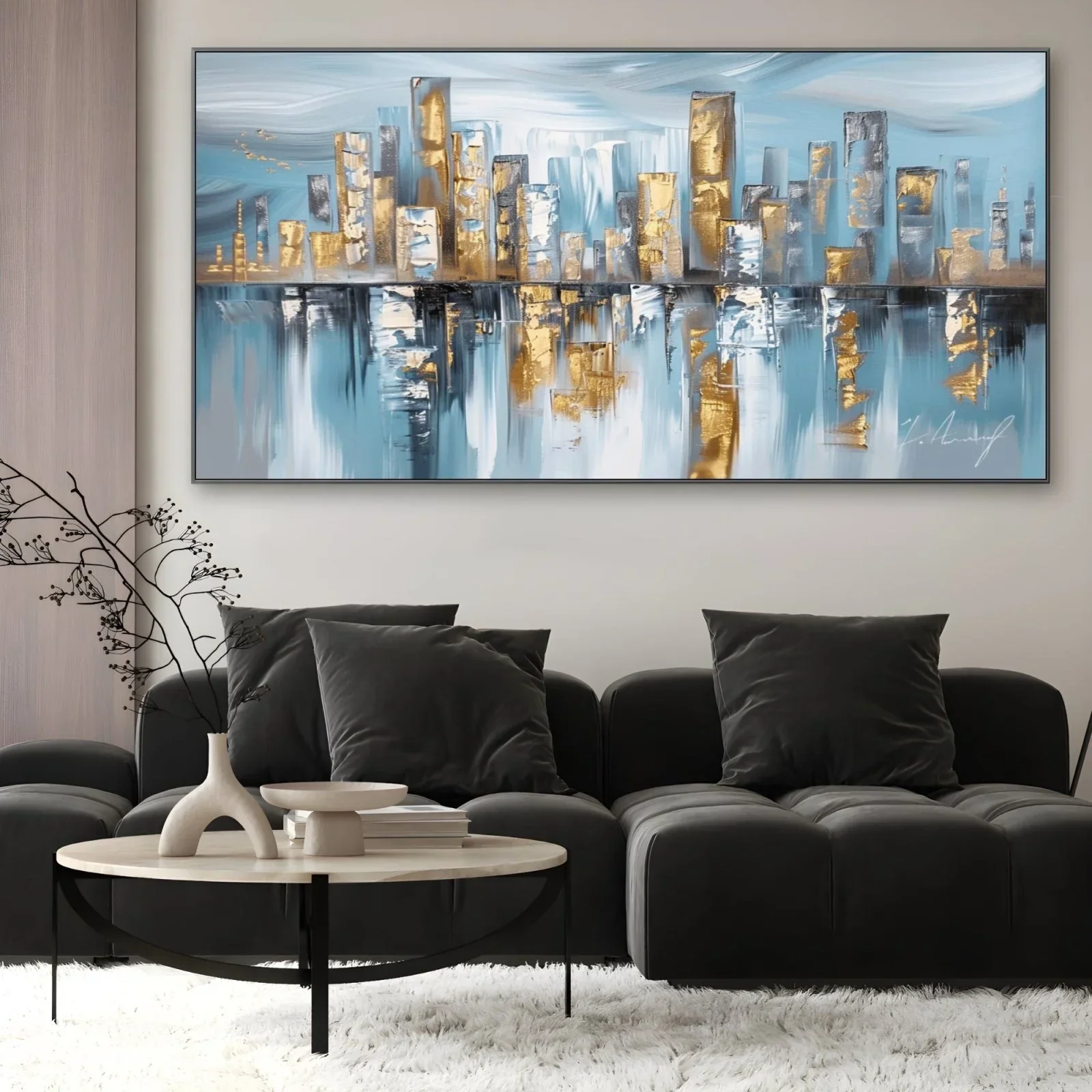 Il quadro raffigura una vibrante skyline urbana riflessa su un corpo d'acqua. Le torri e i grattacieli si ergono maestosi, creando un'immagine suggestiva che cattura l'essenza della vita cittadina.