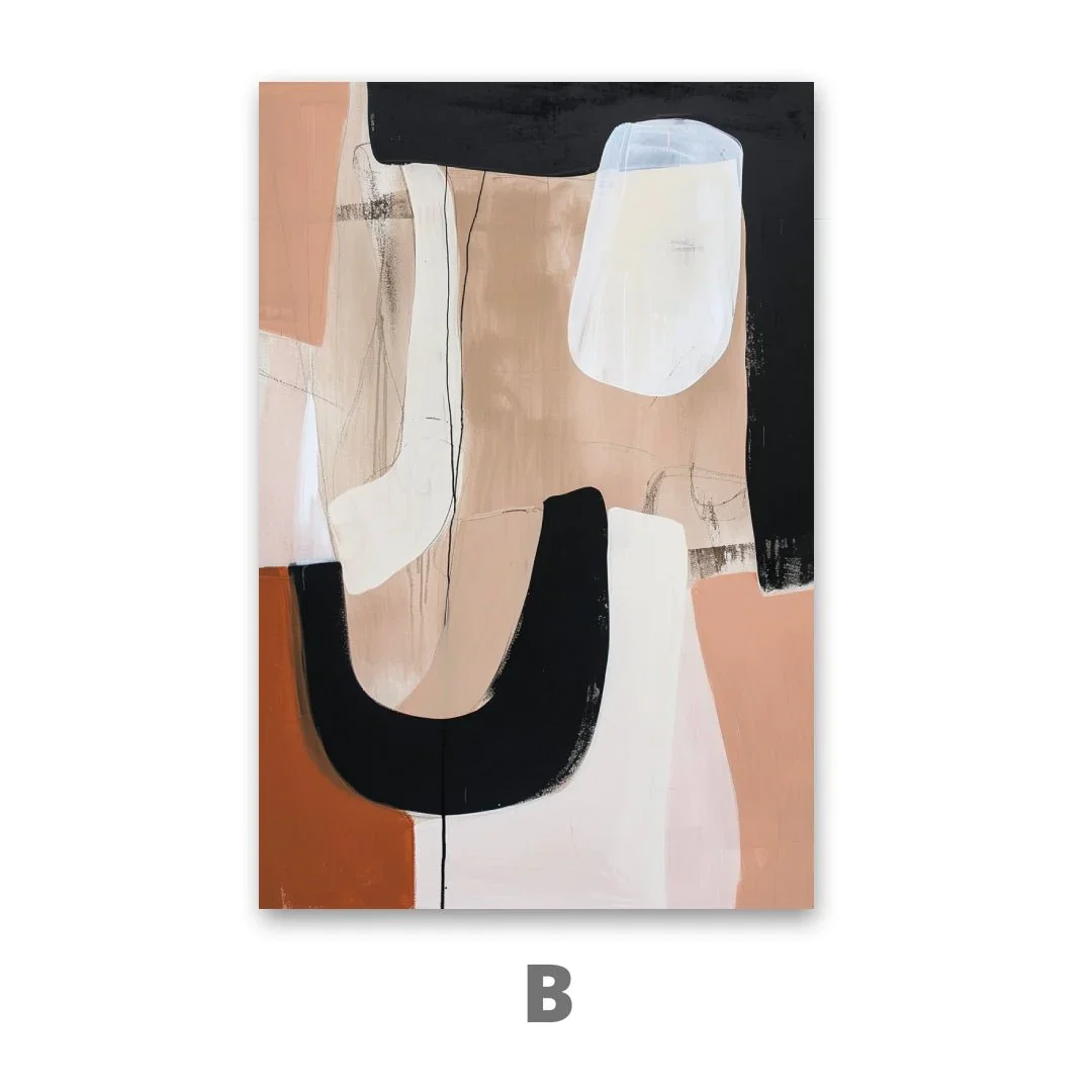 La palette cromatica di "Atmosfera Astratta" è composta principalmente da toni neutri e caldi. I colori predominanti includono il nero profondo, il bianco puro, il beige delicato e un caldo marrone terroso. Questi colori si combinano armoniosamente per creare un effetto visivo equilibrato e rilassante.