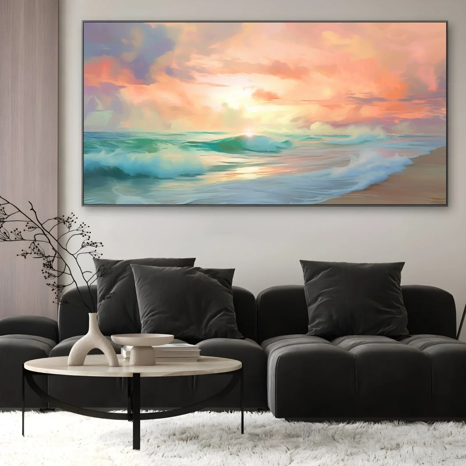 La scena trasmette una sensazione di calma e tranquillità, perfetta per chi desidera portare un angolo di pace nella propria casa. Le onde delicate e il cielo infuocato evocano momenti di riflessione e contemplazione, rendendo questa stampa su tela un'aggiunta ideale per qualsiasi ambiente.