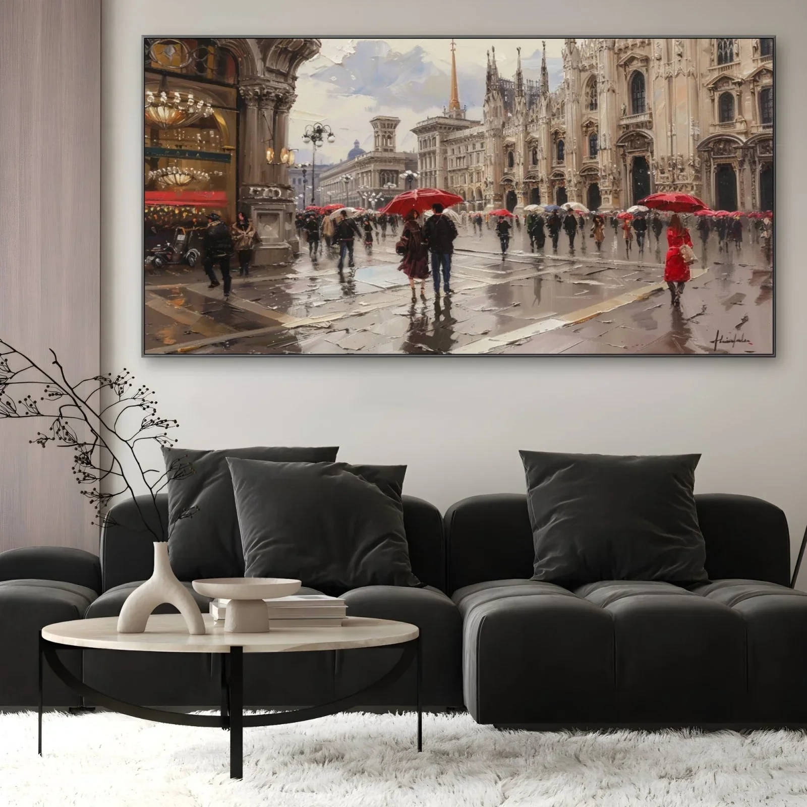 I colori predominanti sono i toni neutri del grigio e del beige, che danno vita alle architetture maestose e dettagliate degli edifici storici. Gli ombrelli rossi e i riflessi dell'acqua sulle strade aggiungono tocchi di colore vivaci e dinamici, mentre il cielo nuvoloso conferisce un'atmosfera malinconica e suggestiva.