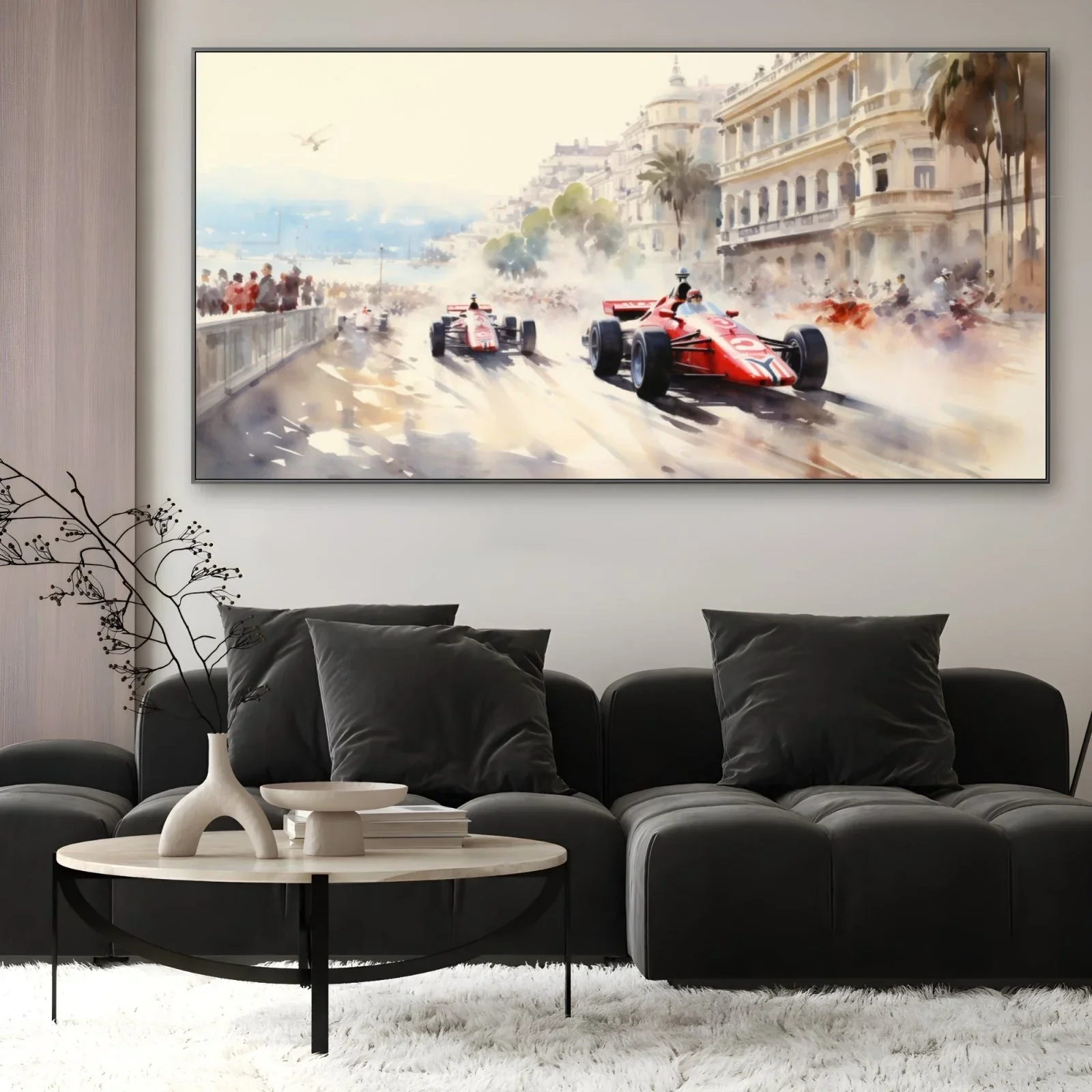 Il quadro "Corsa Infinita" è una stampa su tela che cattura l'emozione e la velocità di una gara automobilistica. Due auto da corsa, dipinte in un vivace rosso, sfrecciano lungo una strada cittadina, circondate da spettatori entusiasti. La scena è ambientata in una città storica, con edifici eleganti e palme che aggiungono un tocco esotico.