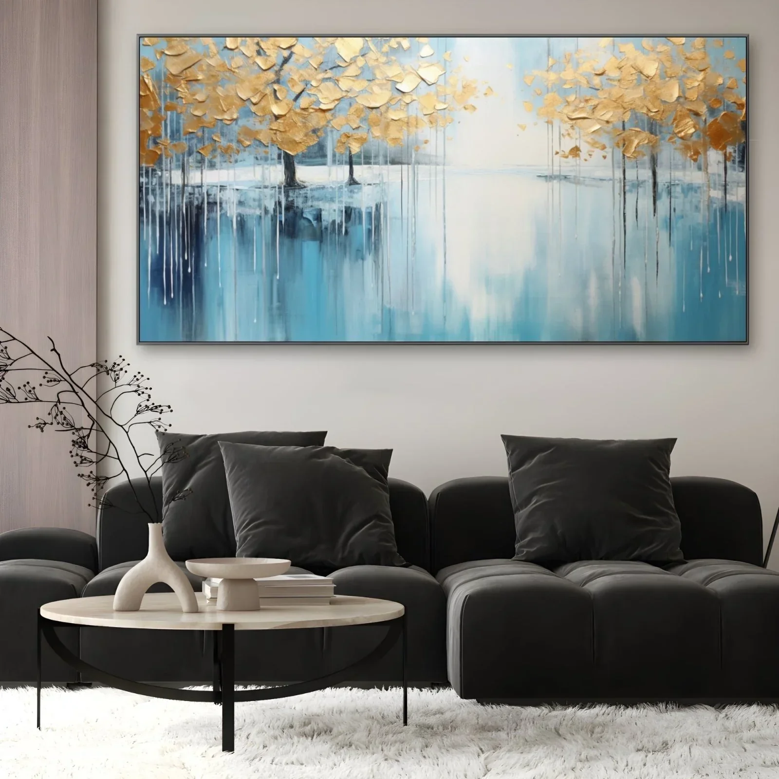 I colori predominanti in questo quadro sono il blu e il bianco, che insieme creano una base calma e rilassante. Le foglie dorate aggiungono un tocco di lusso e calore, creando un equilibrio perfetto tra freschezza e eleganza. Le sfumature di blu variano dal chiaro allo scuro, dando profondità e dimensione all'opera.