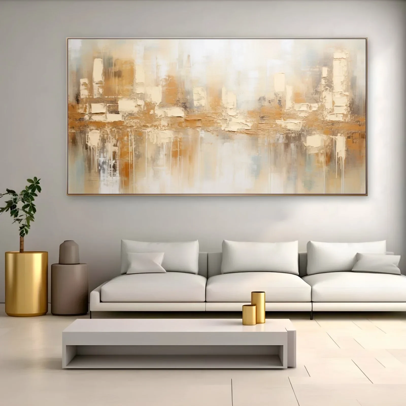 I colori predominanti sono il beige, il bianco e varie tonalità di marrone e arancione, che conferiscono al quadro un'atmosfera calda e accogliente. Tocchi di grigio e blu aggiungono profondità e contrasto, rendendo l'opera visivamente affascinante.