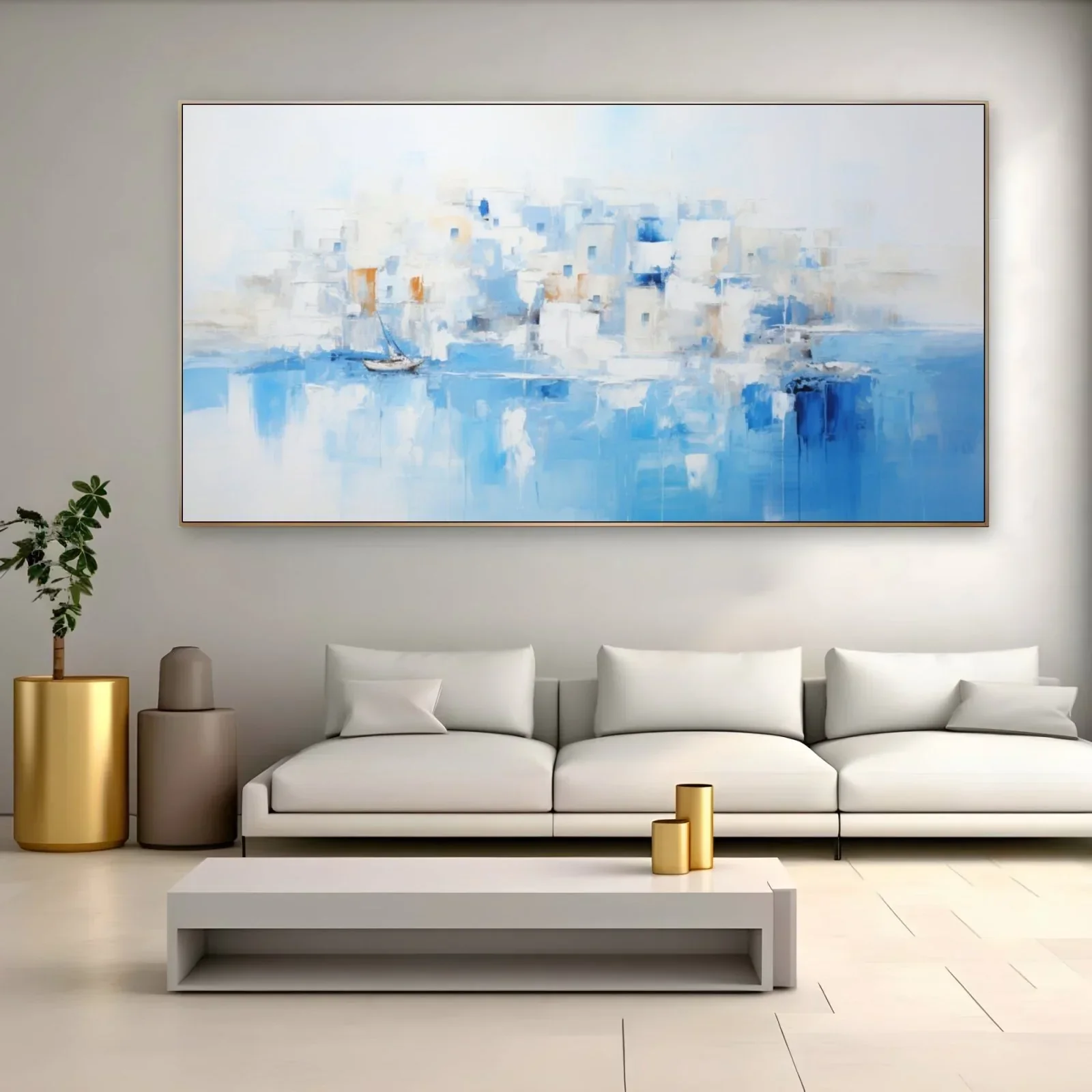 I colori predominanti in questa opera sono il bianco e varie tonalità di blu. Il bianco delle case contrasta armoniosamente con il blu intenso del mare e del cielo, mentre tocchi di arancione e beige aggiungono calore e profondità alla composizione.