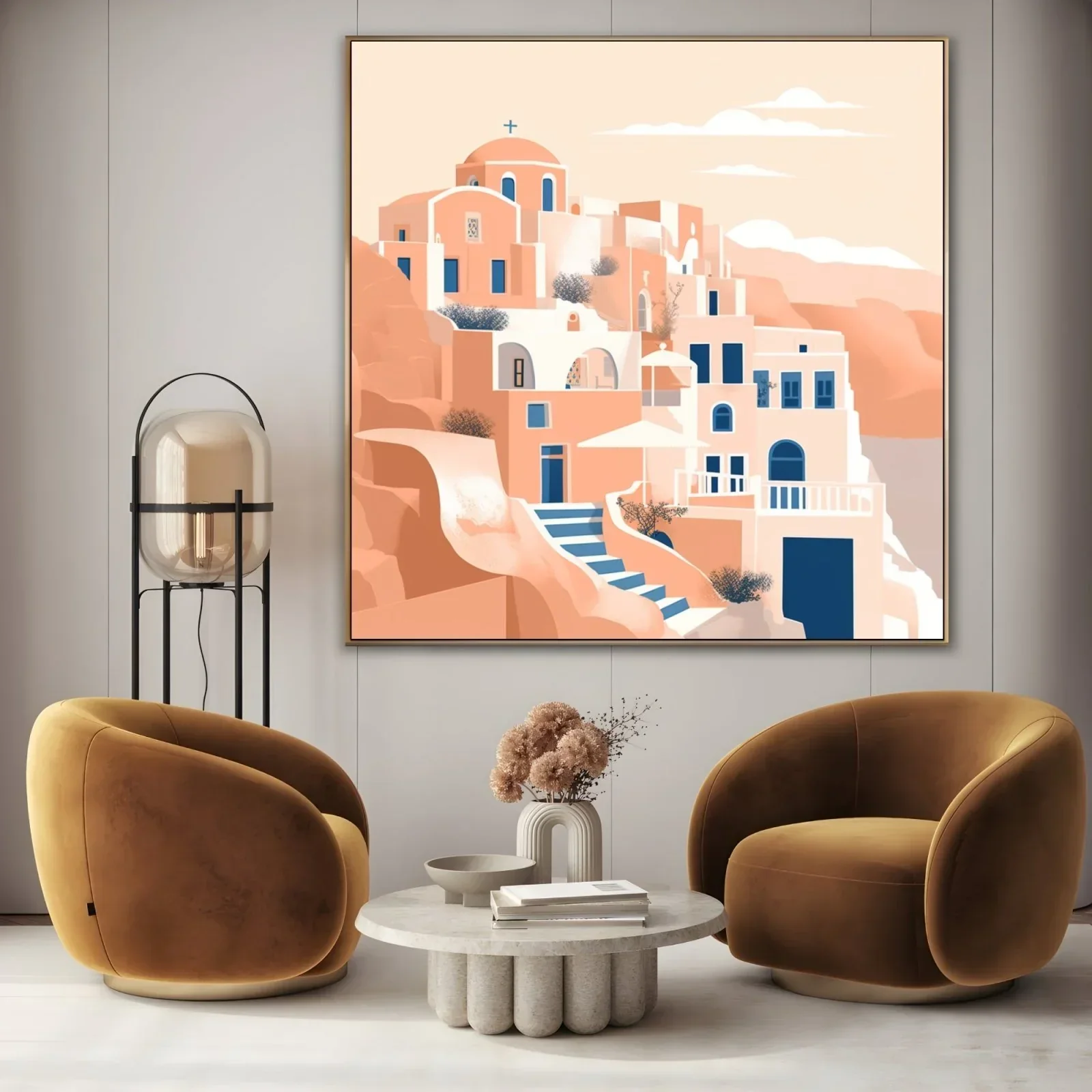 I colori predominanti nel quadro sono il bianco, il blu e varie sfumature di arancione e rosa. Il bianco delle case contrasta splendidamente con il blu intenso dei tetti e delle porte, mentre le tonalità calde dell'arancione e del rosa evocano la luce del tramonto mediterraneo, aggiungendo un tocco di calore e serenità all'intera scena.