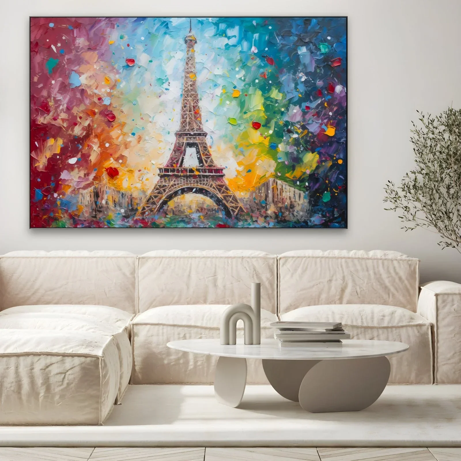 Il quadro rappresenta la maestosa Torre Eiffel, simbolo indiscusso di Parigi, immersa in un turbinio di colori astratti. La struttura iconica si staglia al centro della composizione, emanando un senso di grandezza e bellezza senza tempo.