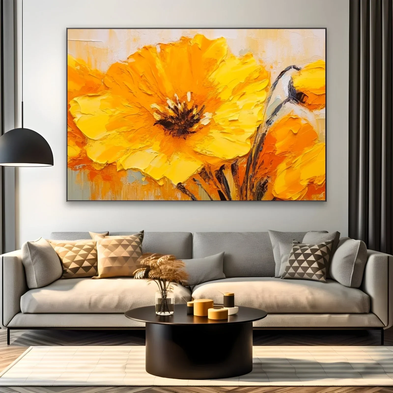 La palette cromatica di questa opera d'arte è dominata da tonalità calde di giallo e arancione, che creano un'atmosfera luminosa e accogliente. Il centro del fiore è dipinto con sfumature di marrone scuro, aggiungendo profondità e contrasto all'immagine complessiva.