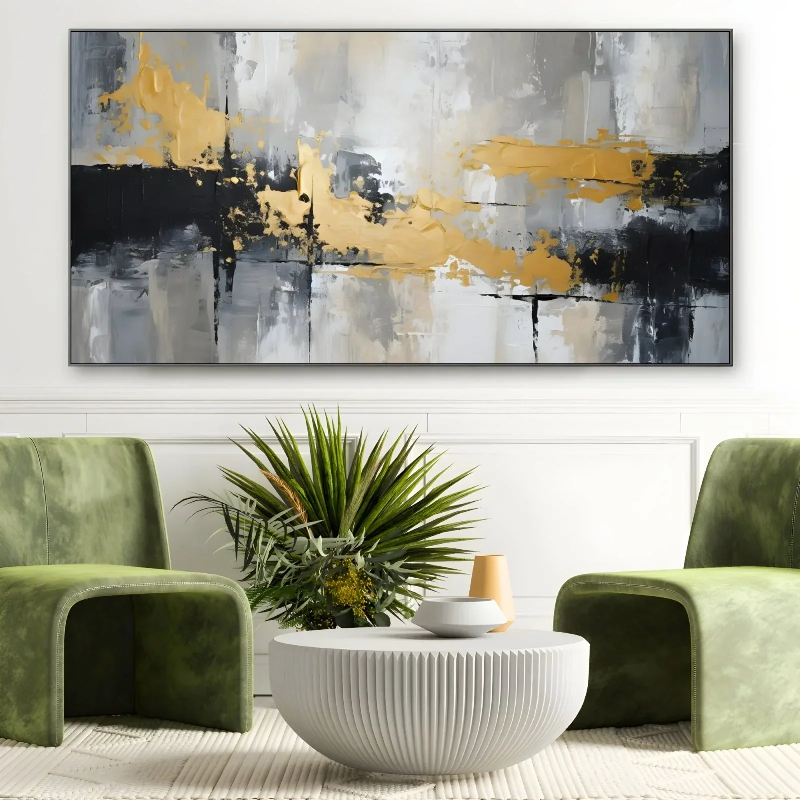 Il quadro "Nero Lussuoso" è una stampa su tela che cattura l'attenzione con la sua composizione astratta e dinamica. La tela presenta un mix di colori intensi e contrastanti, dove il nero profondo si intreccia con sfumature di grigio e tocchi di bianco. Al centro, una striscia dorata brillante attraversa l'opera, aggiungendo un tocco di eleganza e lusso.