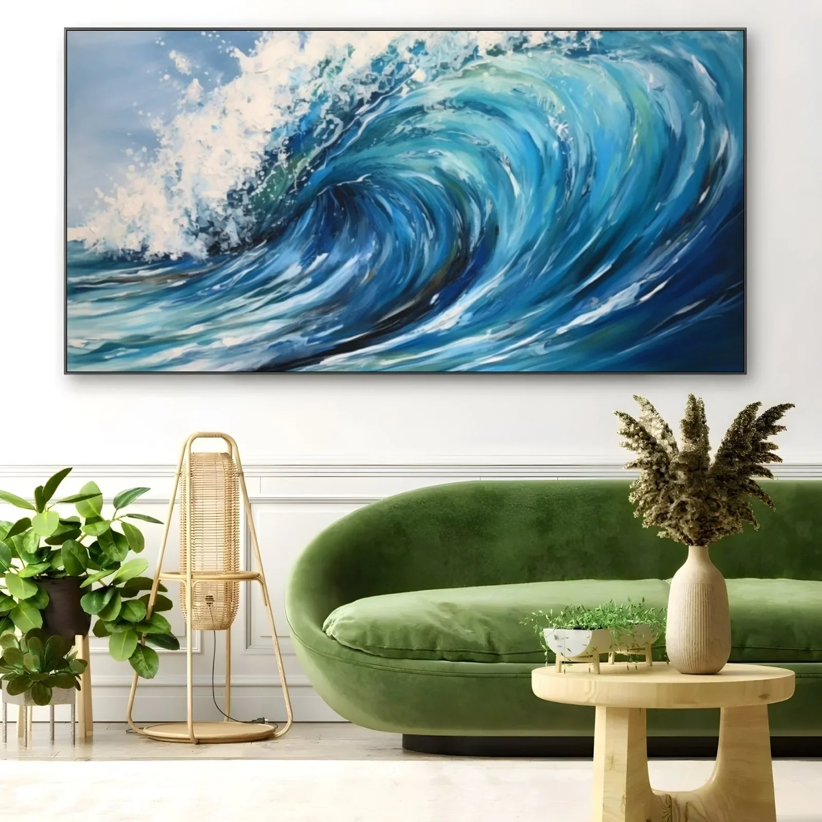 I colori predominanti sono varie tonalità di blu, dal blu scuro al turchese, che conferiscono profondità e movimento all'onda. Gli spruzzi di schiuma bianca aggiungono un tocco di realismo e dinamismo alla scena, mentre sfumature di verde e azzurro completano l'armonia cromatica del quadro.