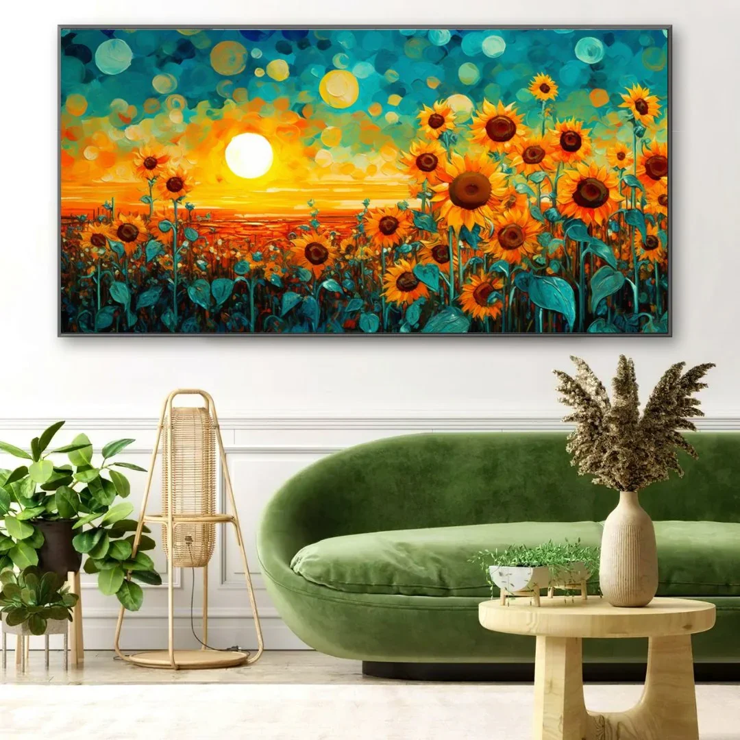 Il quadro rappresenta un campo di girasoli in piena fioritura, illuminato dalla luce dorata del tramonto. Il sole, grande e luminoso, domina il cielo, creando un contrasto spettacolare con i colori vivaci dei fiori. I girasoli, con i loro petali giallo-arancio e i centri marroni, si ergono fieri e maestosi, simbolo di energia e positività.