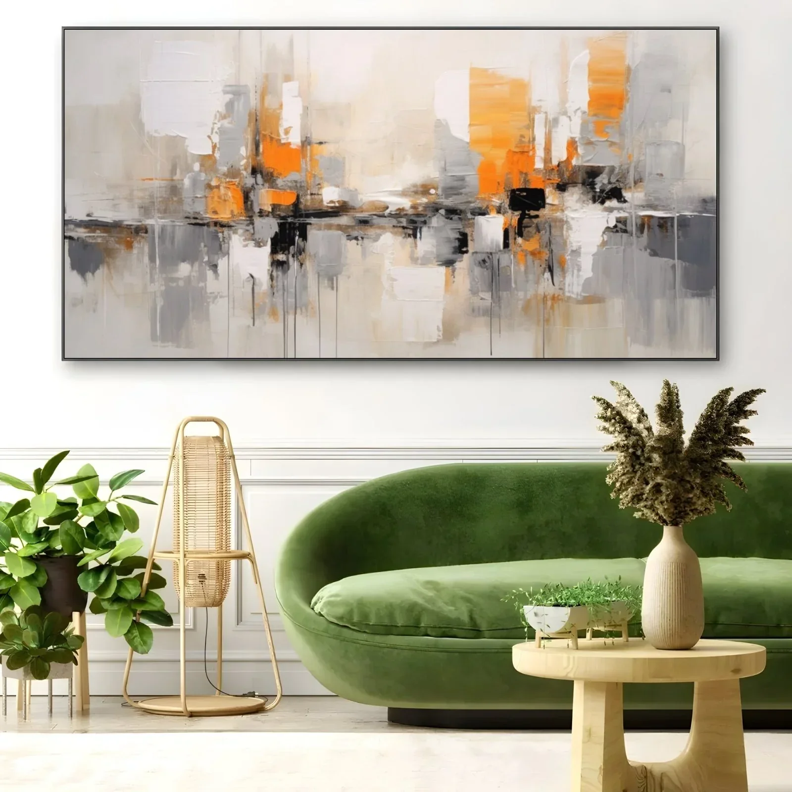 I colori predominanti sono il grigio, il bianco e il nero, che conferiscono al quadro un aspetto sofisticato e contemporaneo. L'arancione brillante aggiunge un tocco di vivacità, creando contrasti accattivanti e punti focali che attirano l'attenzione dello spettatore.