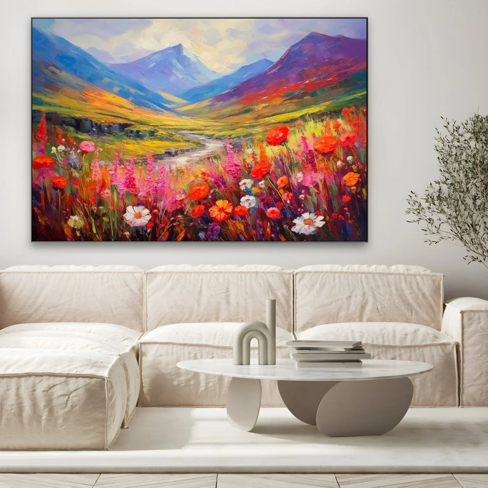 I colori utilizzati in questa opera sono intensi e vibranti. Il rosso dei papaveri e il bianco delle margherite si mescolano armoniosamente con i toni caldi dell'arancione e del rosa. Sullo sfondo, le montagne dipinte con sfumature di blu e viola creano un contrasto affascinante con il verde dei prati e il cielo luminoso.
