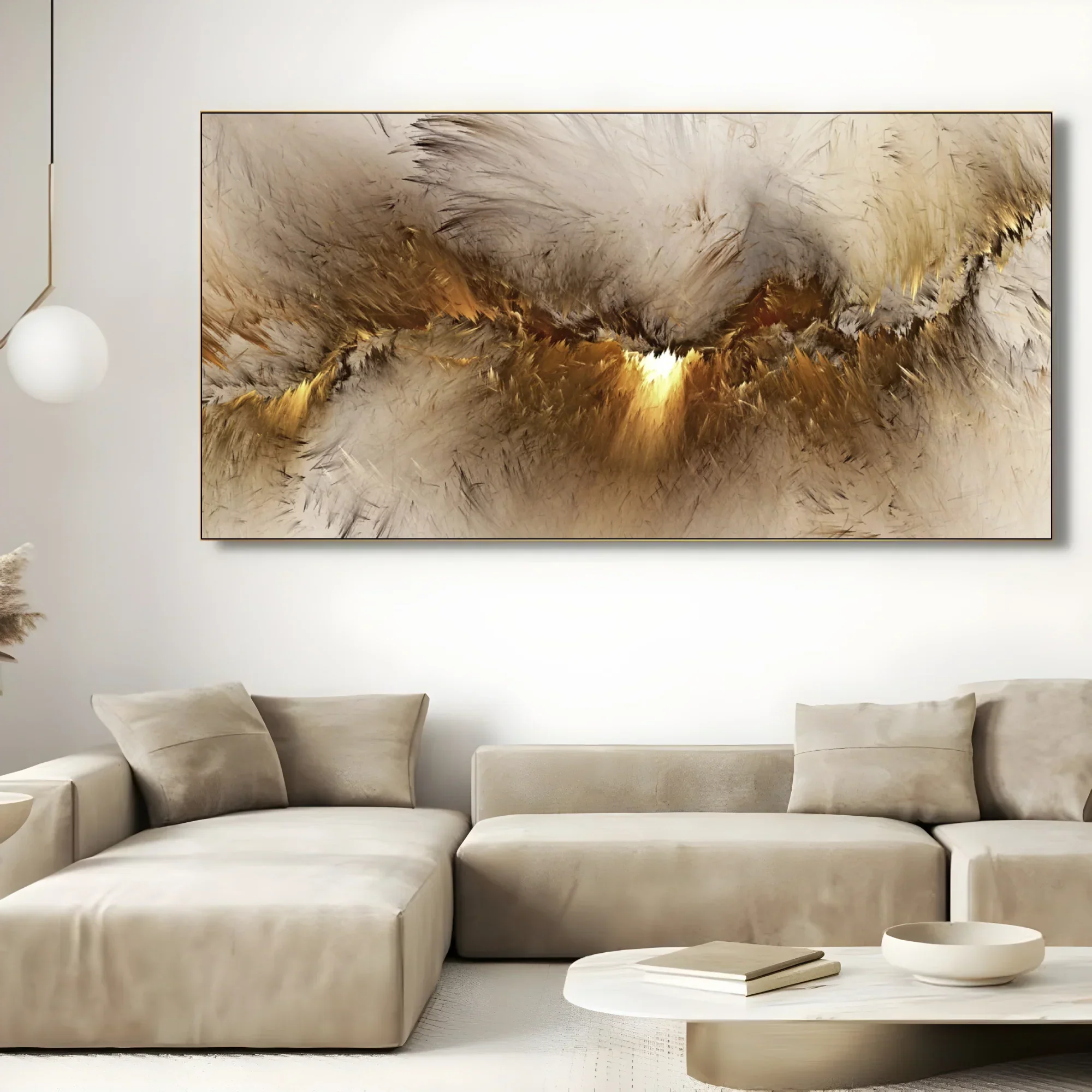 Il quadro rappresenta un'esplosione di luce dorata che emerge da un fondo di toni neutri e caldi. La luce centrale sembra rompere le tenebre, creando un effetto visivo affascinante e dinamico. È come se un raggio di sole stesse penetrando attraverso le nuvole, portando con sé un senso di speranza e rinascita.