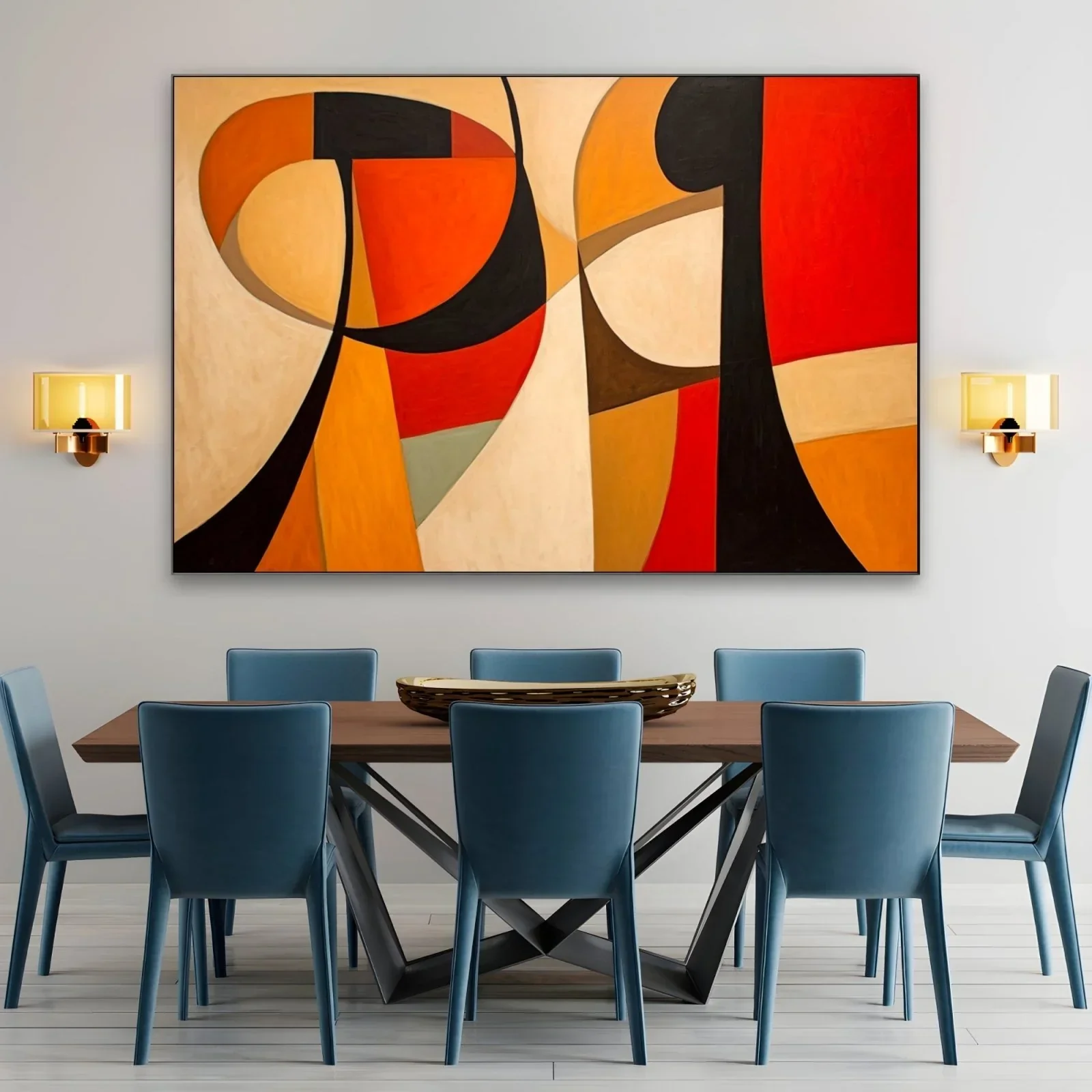 I colori predominanti in questo quadro sono il rosso, l'arancione e il nero, che si mescolano con tonalità più tenui di beige e grigio. Questi colori caldi e contrastanti creano un effetto visivo accattivante, rendendo l'opera un punto focale ideale per qualsiasi ambiente.