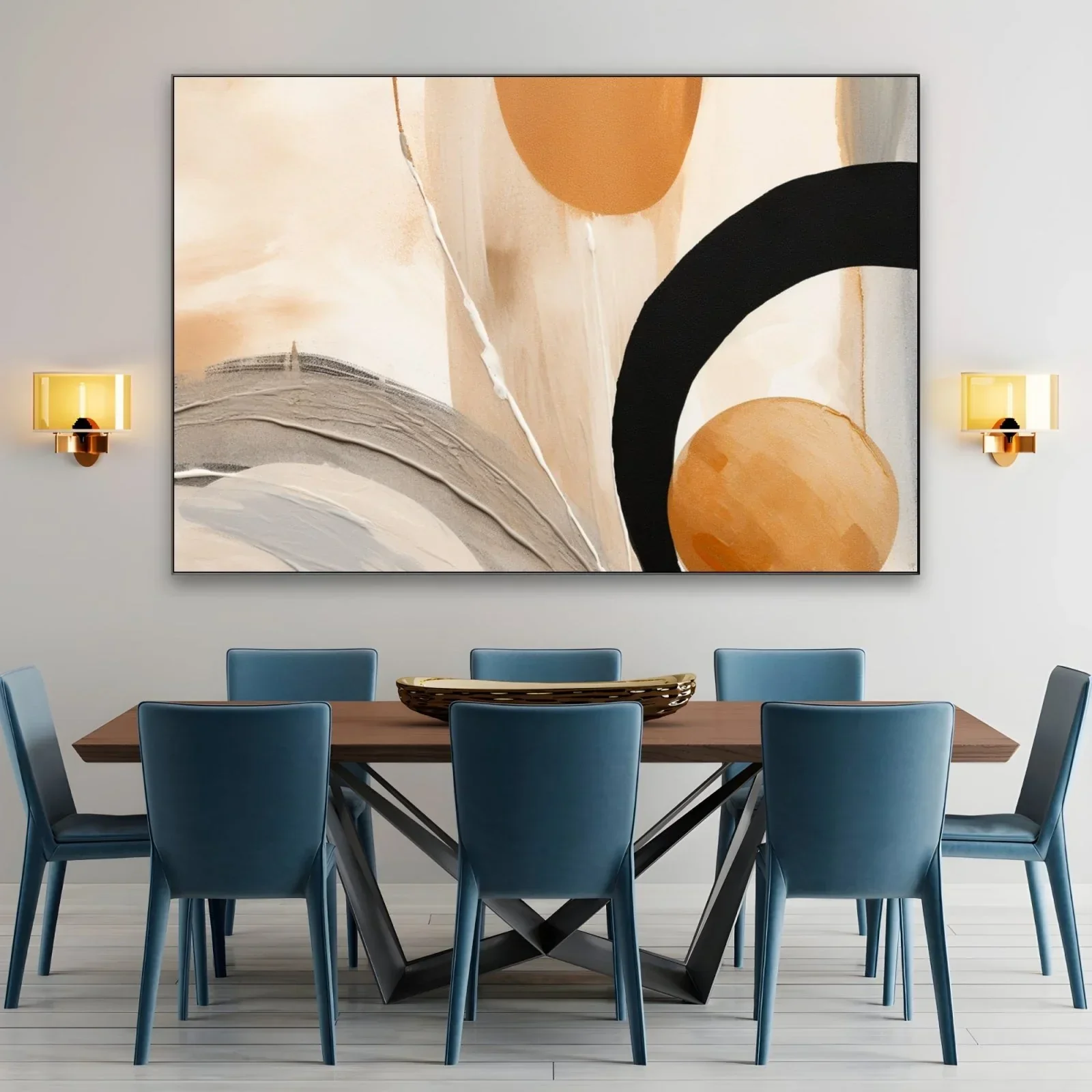 Il dipinto presenta tonalità di beige, crema e marrone chiaro, con accenti di nero e arancione bruciato. Le forme fluide e le linee morbide si intrecciano armoniosamente, evocando l'immagine delle dune di sabbia mosse dal vento. Gli elementi circolari e curvilinei aggiungono profondità e movimento alla composizione, rendendola visivamente intrigante.