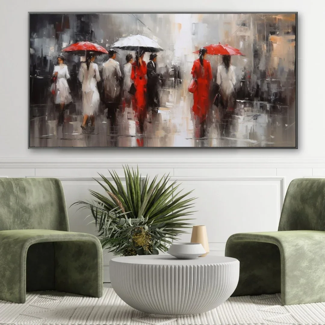 Il quadro trasmette un senso di movimento e interazione umana, nonostante la pioggia che cade. Le pennellate sfumate e i contorni indistinti contribuiscono a creare un'atmosfera quasi onirica, rendendo questa opera d'arte perfetta per aggiungere un tocco di eleganza e modernità a qualsiasi ambiente.