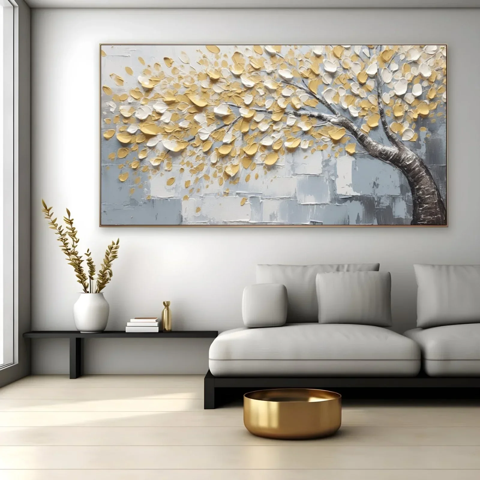 I colori predominanti in questo quadro sono il dorato, il bianco e varie sfumature di grigio. Lo sfondo è composto da blocchi di colore grigio chiaro e scuro, creando un contrasto elegante con le vivaci tonalità delle foglie. Il tronco dell'albero è dipinto con toni scuri, che mettono in risalto la texture e i dettagli intricati dell'opera.