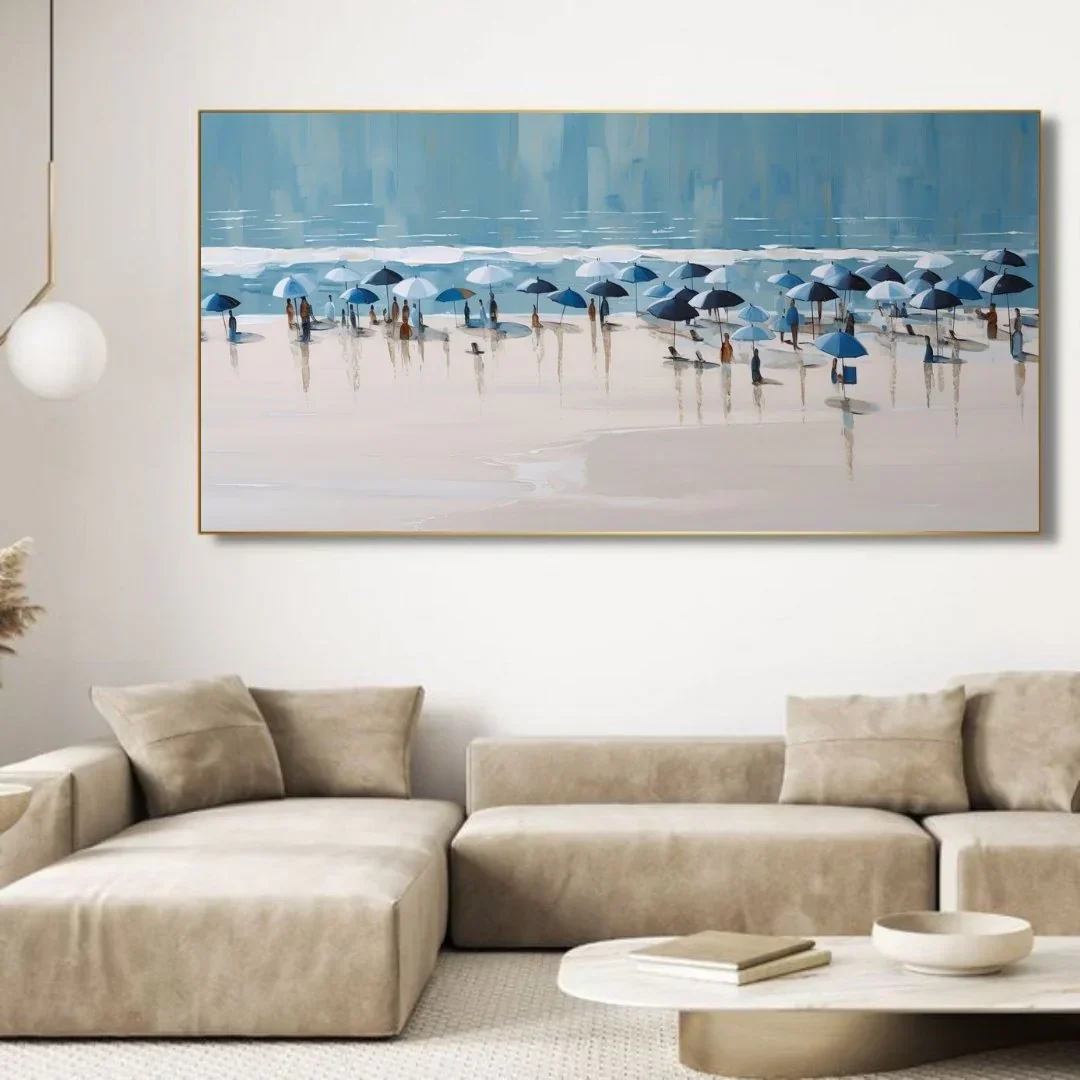 I colori predominanti del quadro sono il blu e il bianco degli ombrelloni, che contrastano splendidamente con le tonalità sabbiose della spiaggia. Sullo sfondo, il mare e il cielo si fondono in sfumature di azzurro, creando un effetto visivo armonioso e sereno.