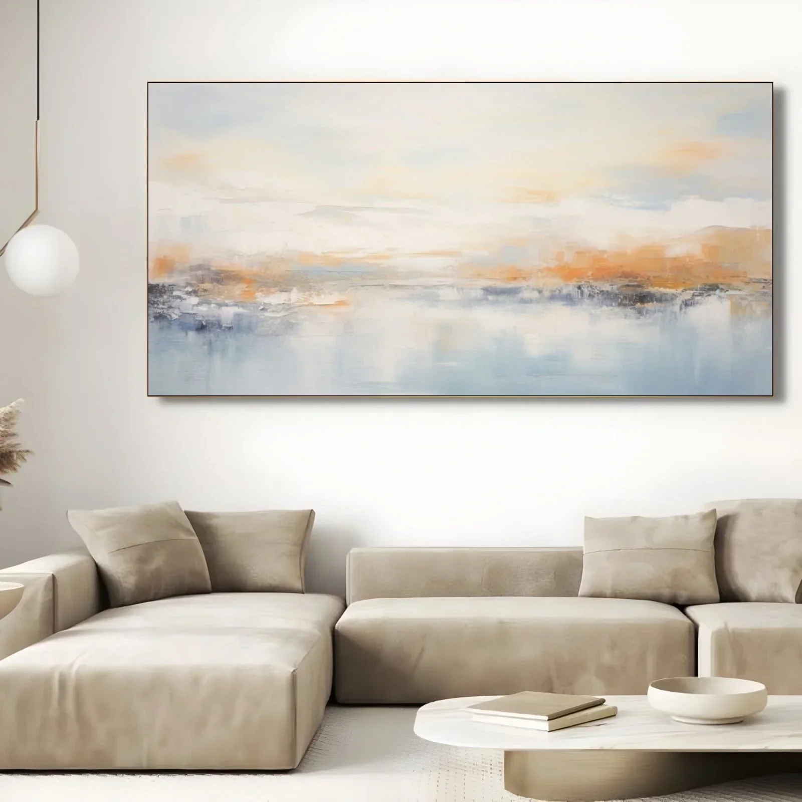 I colori utilizzati sono delicati e armoniosi. Toni di blu chiaro e bianco dominano la parte inferiore della tela, suggerendo un riflesso d'acqua o un cielo limpido. Le sfumature di arancione e beige nella parte superiore aggiungono calore e profondità, creando un contrasto piacevole e rilassante.