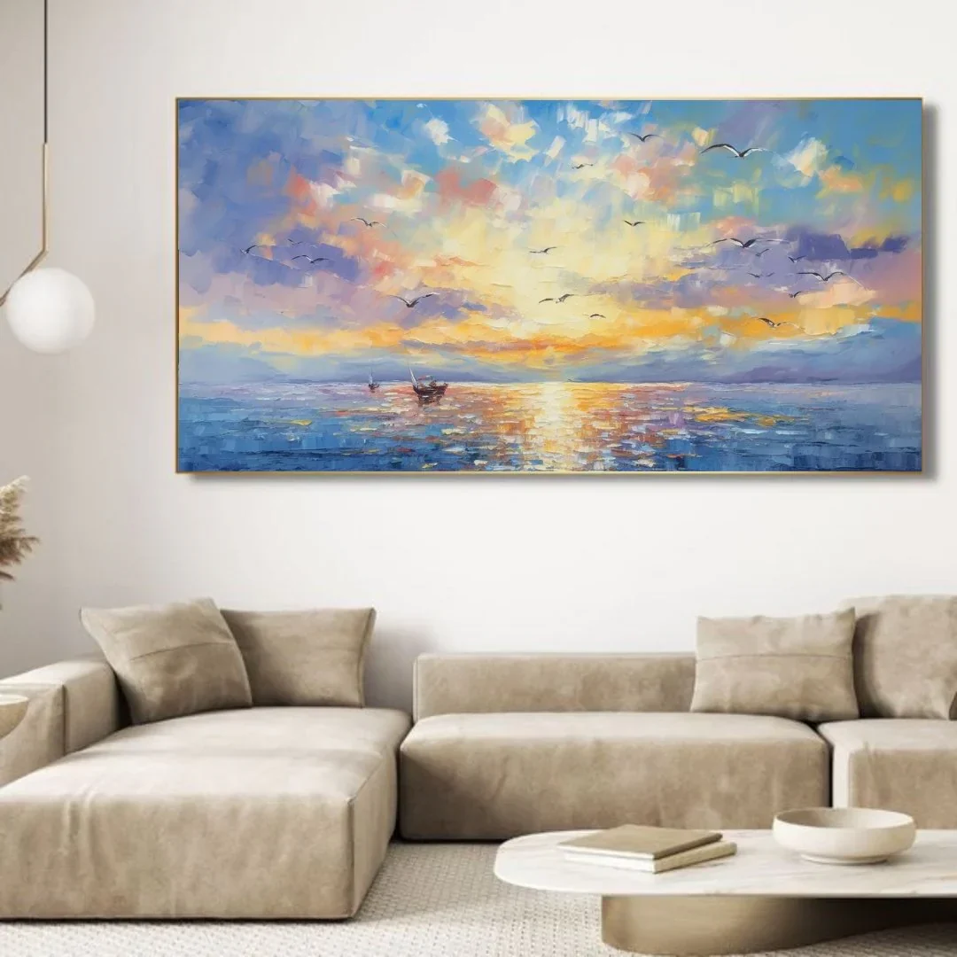Questa stampa su tela rappresenta un incantevole tramonto sul mare, catturando la bellezza naturale del cielo e dell'oceano in un momento di quiete e serenità. Il dipinto mostra un cielo variopinto con sfumature di blu, arancione, rosa e giallo, che si riflettono sulle onde calme del mare sottostante.
