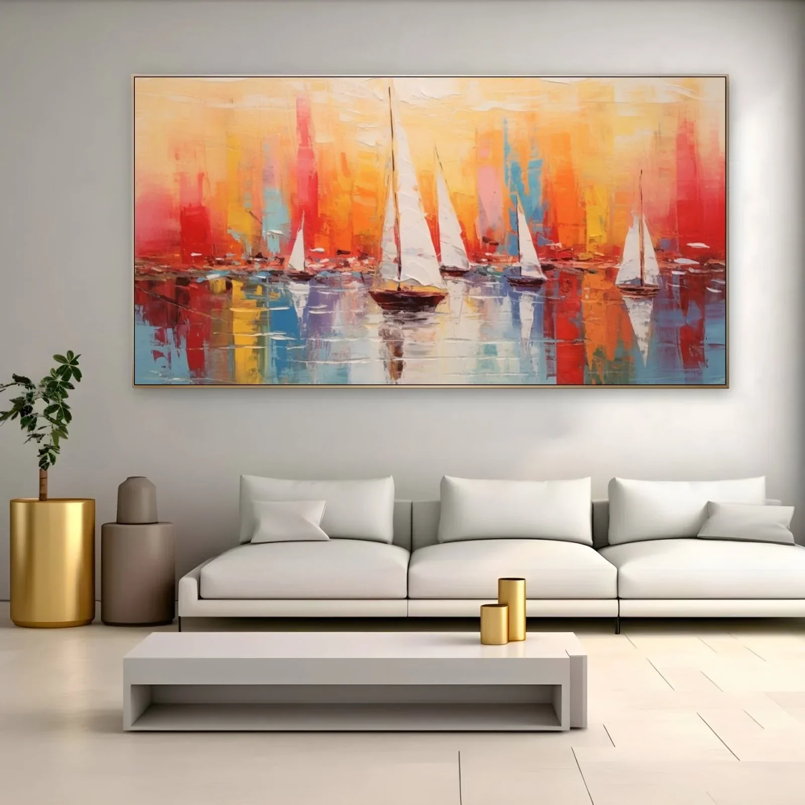 I colori utilizzati in questa opera sono intensi e caldi, con predominanza di rosso, arancione e giallo per il cielo, che sfumano dolcemente verso il blu e l'azzurro dell'acqua. Le vele bianche delle barche creano un contrasto armonioso con lo sfondo colorato, aggiungendo un tocco di eleganza alla scena.