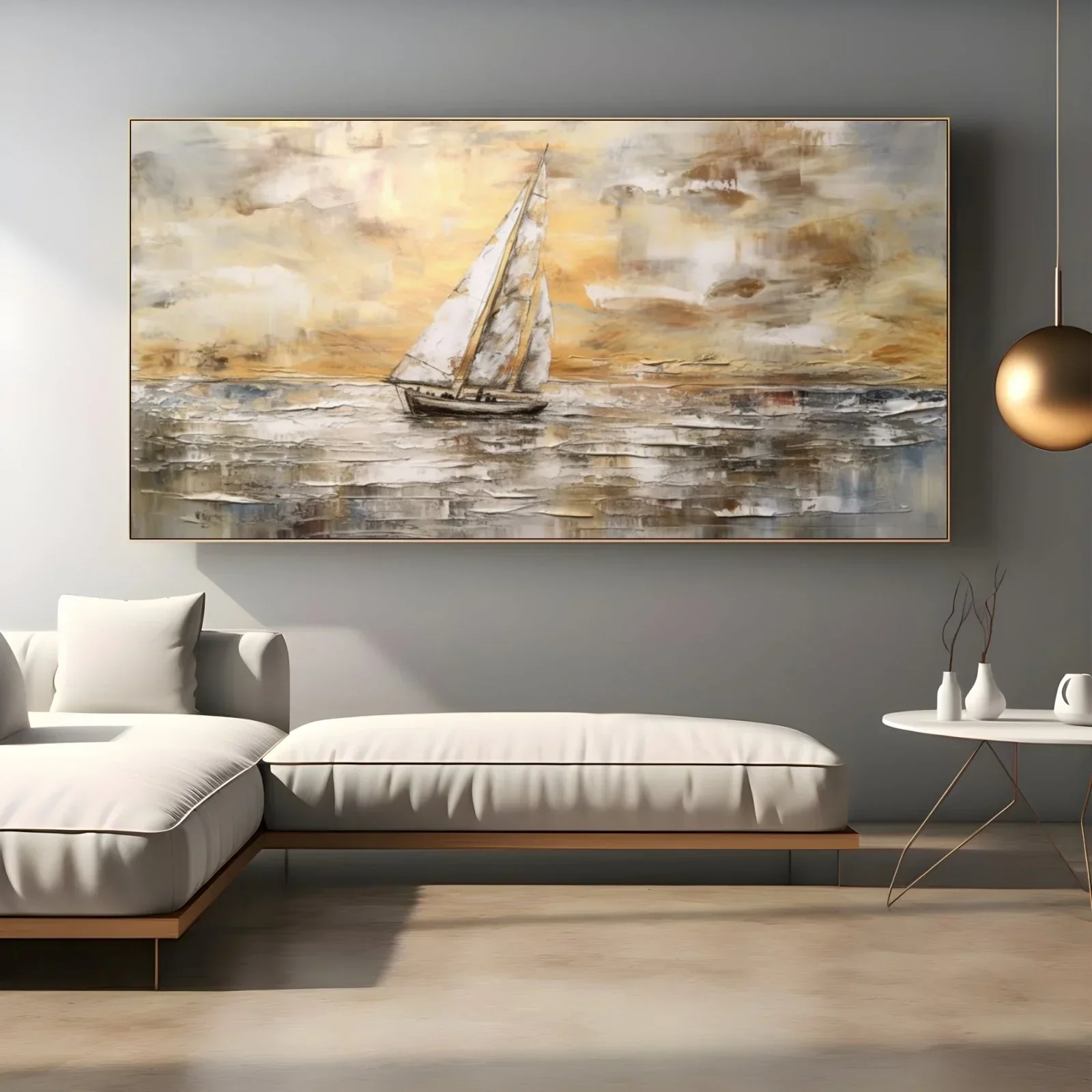 Il quadro "Vela Dorata" è una stampa su tela che cattura l'essenza della tranquillità marina. Rappresenta una barca a vela solitaria che naviga su un mare calmo, immersa in un'atmosfera serena e contemplativa.